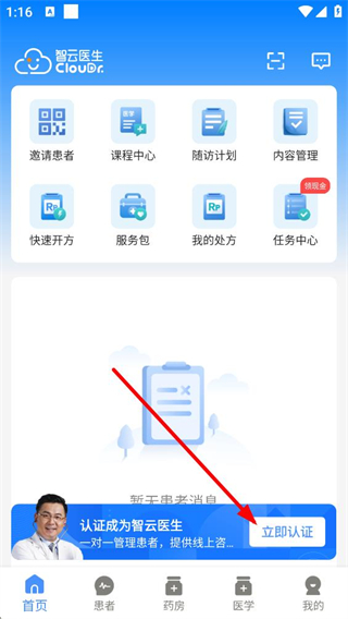1、進入智云醫生首頁,可使用邀請患者、課程中心等功能,點擊立即認證可進入醫生認證備案流程,認證后能一對一管理患者、提供線上服務。
