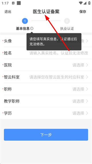 2、進入醫生認證備案的基本信息頁,需填寫頭像、姓名等真實信息,認證后信息無法修改,填寫完成后點擊下一步繼續認證流程。