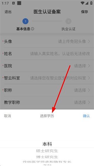 4、基本信息頁選擇學歷時,會彈出學歷選項列表,可挑選本科、碩士研究生等學歷,選好后點擊確認即可完成該信息的填寫。