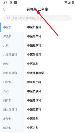 3、選擇智云科室界面,可通過搜索框查找科室,也能分類列表中選擇對應科室,完成科室信息的選擇以推進認證。