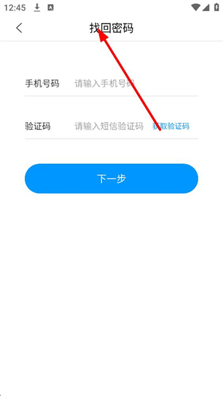 4、若忘記密碼,可進入找回密碼頁面,輸入手機號碼,獲取并輸入短信驗證碼,點擊下一步完成密碼找回,重新設置登錄密碼。