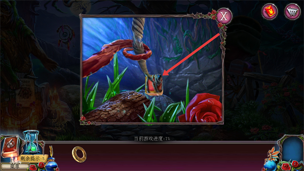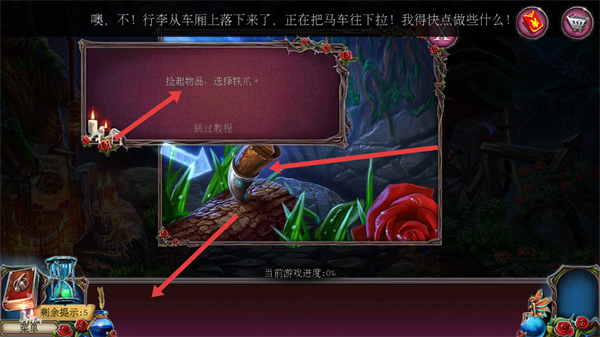4、利用獲取的物品如鐵爪,在場景里進行操作,解決如纏繞的繩索等難題,提升游戲進度,繼續冒險解謎。