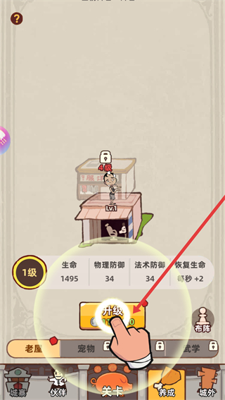 4、可升級老屋,提升生命、防御等屬性,強化自身實力,為后續關卡戰斗和伙伴養成提供支持。