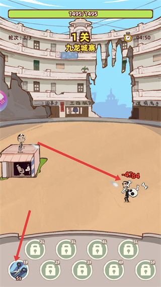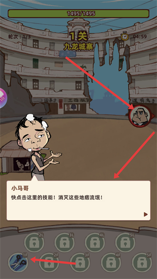1、可選擇關卡如九龍城寨,點擊技能按鈕釋放技能,消滅地痞流氓,推進關卡進程。