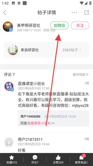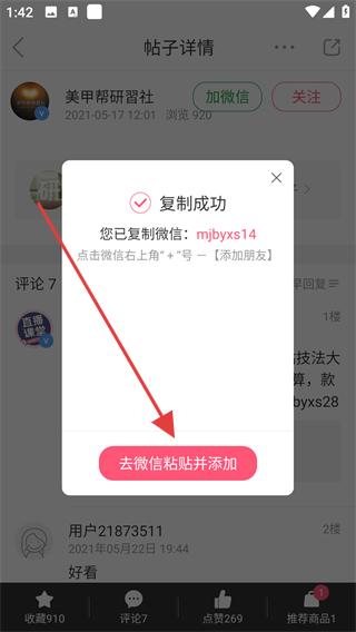 3、點擊去微信粘貼并添加,完成美甲幫研習社微信好友的添加,以便獲取更多美甲學習資源與咨詢。