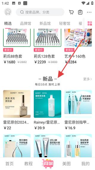 4、添加好友后返回軟件進入商城頁面,瀏覽精選、品牌館等分類,查看莉氏88色套、雷尼原創等美甲商品,了解商品價格與套裝內容,挑選心儀的美甲產品。