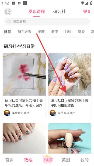 1、進入軟件發現課程頁面瀏覽研習社學習日常的美甲教程,如美甲筆的洗筆開筆保養、美甲拍照修圖等教程,選擇感興趣的教程,開啟美甲學習體驗。
