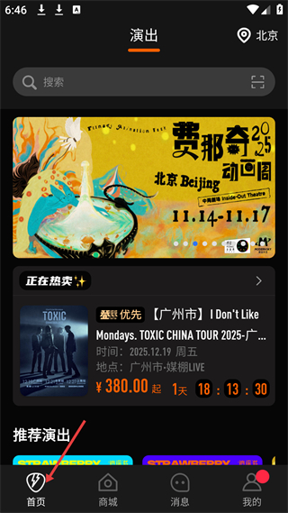 2、演出票務APP首頁,展示演出板塊,有搜索欄,呈現熱賣和推薦演出,底部有首頁等功能導航。