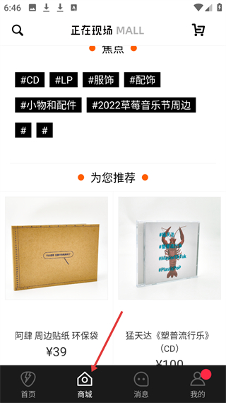 3、商城界面,即正在現場MALL,有分類標簽,推薦周邊商品,方便用戶選購演出周邊。