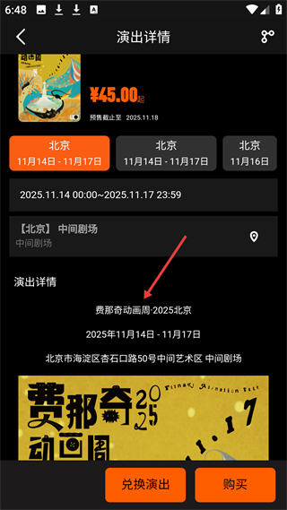 4、演出詳情界面,展示費那奇動畫周演出,標注票價、時間、地點,提供兌換和購買入口。