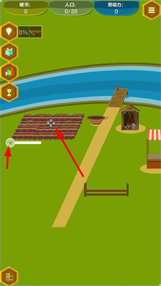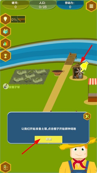 1、根據提示開始準備土壤點擊棚子開始耕種場地,點擊好的按鈕,再點擊棚子,開啟耕種場地的操作。