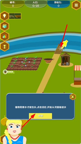 3、看到提示植物需要水才能生長點擊泊位開始從河里輸送水,點擊好的按鈕,再點擊泊位,為植物輸送生長所需的水。