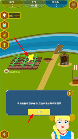 4、待農作物成熟后,看到提示農場準備收獲農作物點擊農場挖并收獲蔬菜,點擊好的按鈕,再點擊農場,收獲種植的蔬菜。