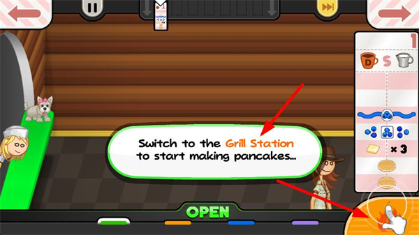 3、按照提示切換到烤制工位,準備開始制作煎餅,推進餐品的進一步制作流程。