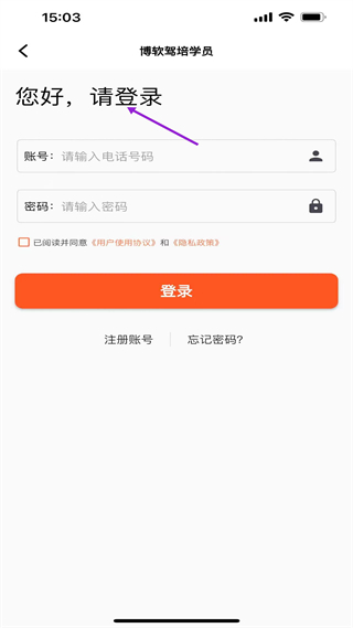 1、登錄界面,支持手機號密碼登錄,需勾選協議政策,是使用平臺學車功能的前置流程,保障信息合規使用。