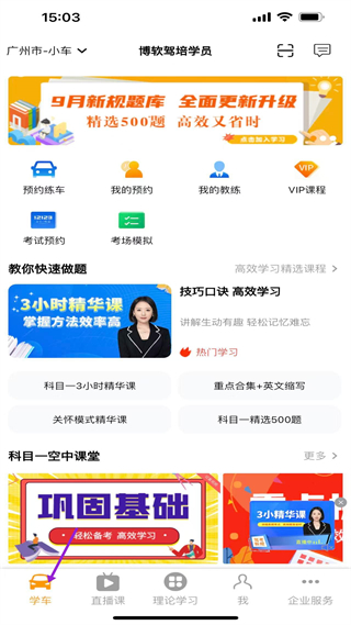 2、學車模塊,提供預約練車等功能,含考場模擬工具,整合科目一精華課等資源,適配學員學車全流程需求。