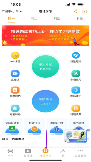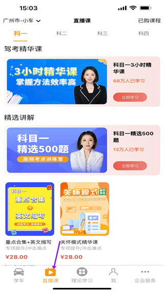 3、直播課模塊,分科目展示駕考課程,含精選題庫等內容,支持付費學習,助力學員理論知識的備考。