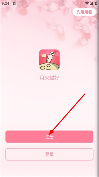 1、打開應用首先看到帶有兔子圖標和月來越好字樣的界面,有注冊、登錄按鈕,右上角還有先用用看選項,可選擇注冊或登錄進入應用。