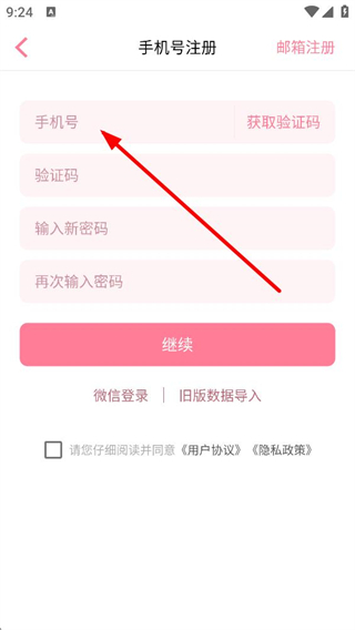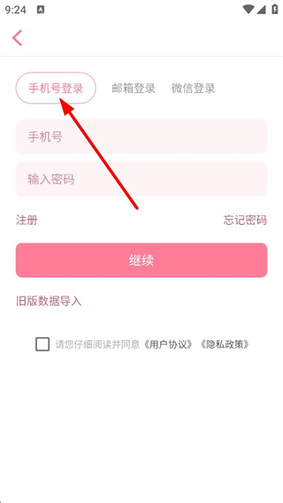 4、若選擇登錄,可選擇手機號登錄,填寫手機號和密碼,也可選擇郵箱登錄、微信登錄,還能進行舊版數據導入,登錄前需同意用戶協議和隱私政策。