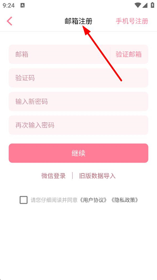 3、注冊頁面也可選擇郵箱注冊,需填寫郵箱、驗證郵箱、輸入新密碼、再次輸入密碼,同樣有微信登錄和舊版數據導入的選項。