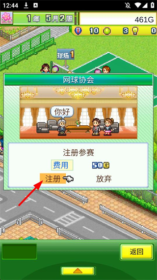2、進入網球協會界面,可進行注冊參賽操作,注冊需要花費50G,點擊注冊按鈕,即可完成參賽的注冊步驟。