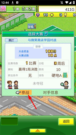3、注冊后進入選擇大賽界面,可看到與微笑商店學園對戰的賽事,點擊參戰按鈕,即可參與該賽事,獲取對應的獎金與點數。