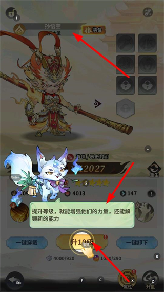 3、可給角色如孫悟空升級,提升等級能增強力量、解鎖新能力,還可穿戴裝備,進一步提升角色戰力。