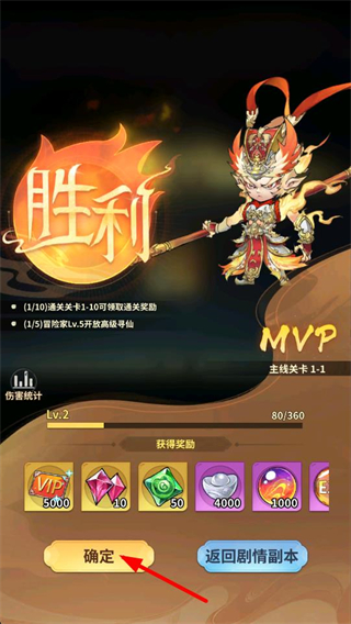 2、戰斗勝利后可獲得VIP、鉆石、翡翠等獎勵,點擊確定領取獎勵,提升角色戰力,開啟新的劇情副本。