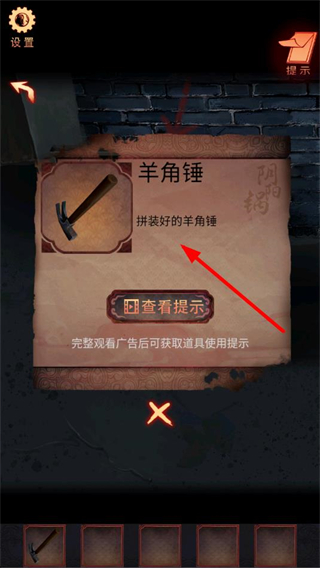 3、可獲取拼裝好的羊角錘,可查看提示完整觀看廣告后獲取,利用羊角錘推進解謎環節。