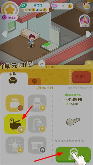 4、租客入住后進入房間界面,選擇廁所的對應設施,點擊升級按鈕,為房間添加廁所,提升房間的功能與租客滿意度。