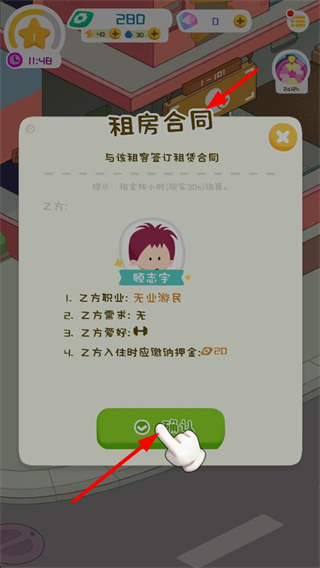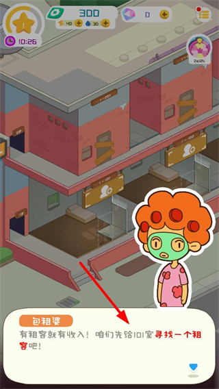 1、看到提示有租客就有收入,咱們先給101室尋找一個租客吧,按照引導開始為101室招募租客,推進租房經營流程。