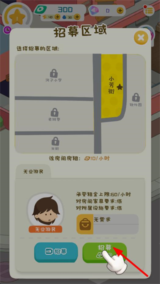 2、進入招募區域界面選擇小芳街區域,查看該區域租客如無業游民的信息,點擊招募按鈕,為101室確定租客人選。