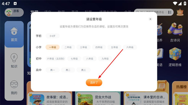 1、進入年級設置頁面,選擇所在年級,如小學一年級,點擊選好了進入首頁。