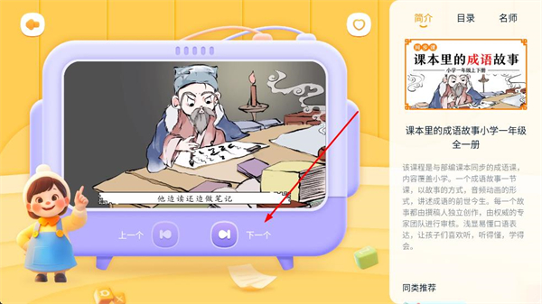 4、在課程播放頁面觀看課程視頻,查看課程簡介,點擊下一個,繼續觀看后續課程內容,完成成語故事課程的學習。