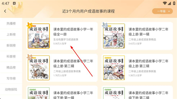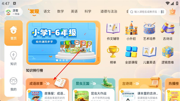 2、在首頁可看到發現板塊的各類學科分類和知識排行榜,選擇成語故事板塊,點擊進入成語故事課程列表頁面。
