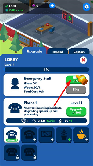 1、在大廳界面,可雇傭應急工作人員處理來電事件,升級電話1能加快通話處理速度,消耗資源提升設施效率。