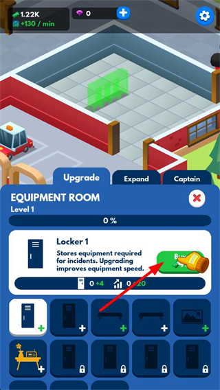 3、進入裝備室界面,購買儲物柜1可提升裝備取用速度,裝備是處理事件的必需物品,持續升級設施來優化流程。