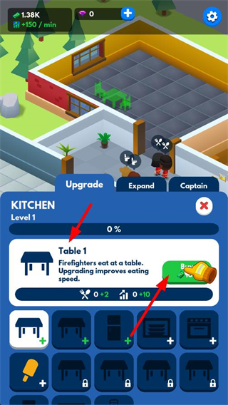 4、打開廚房界面,購買餐桌1能提升消防員的用餐速度,保障人員狀態,助力更高效地應對后續的應急任務。