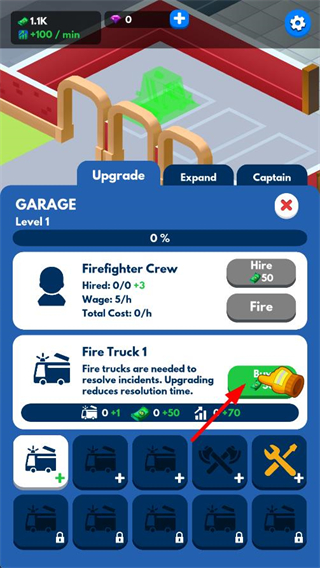 2、切換到車庫界面,可雇傭消防員隊伍,升級消防車1能減少事件解決時間,配置車輛助力處理應急事件。