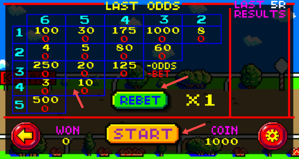 2、進行游戲操作:點擊分值框下注,點擊START開始游戲,點擊REBET調節下注分數,等待比賽結果。