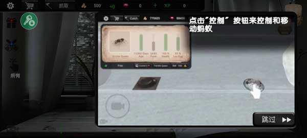 3、控制螞蟻行動:點擊“控制”按鈕控制和移動螞蟻,進行筑巢、獲取螞蟻并放入試管等操作。
