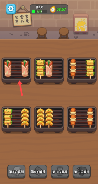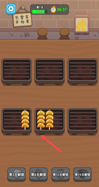 3、達成通關:消除全部的燒烤串即可成功通關本關卡。