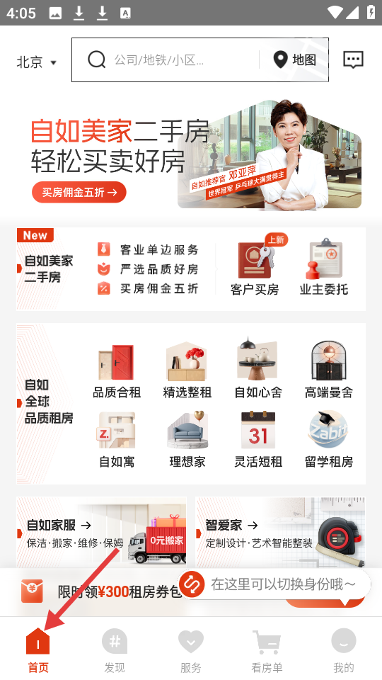 1、首頁定位北京設有搜索欄,主推自如美家二手房,推出買房傭金五折優惠,涵蓋品質合租等多樣租房類型,還有自如家服等服務。