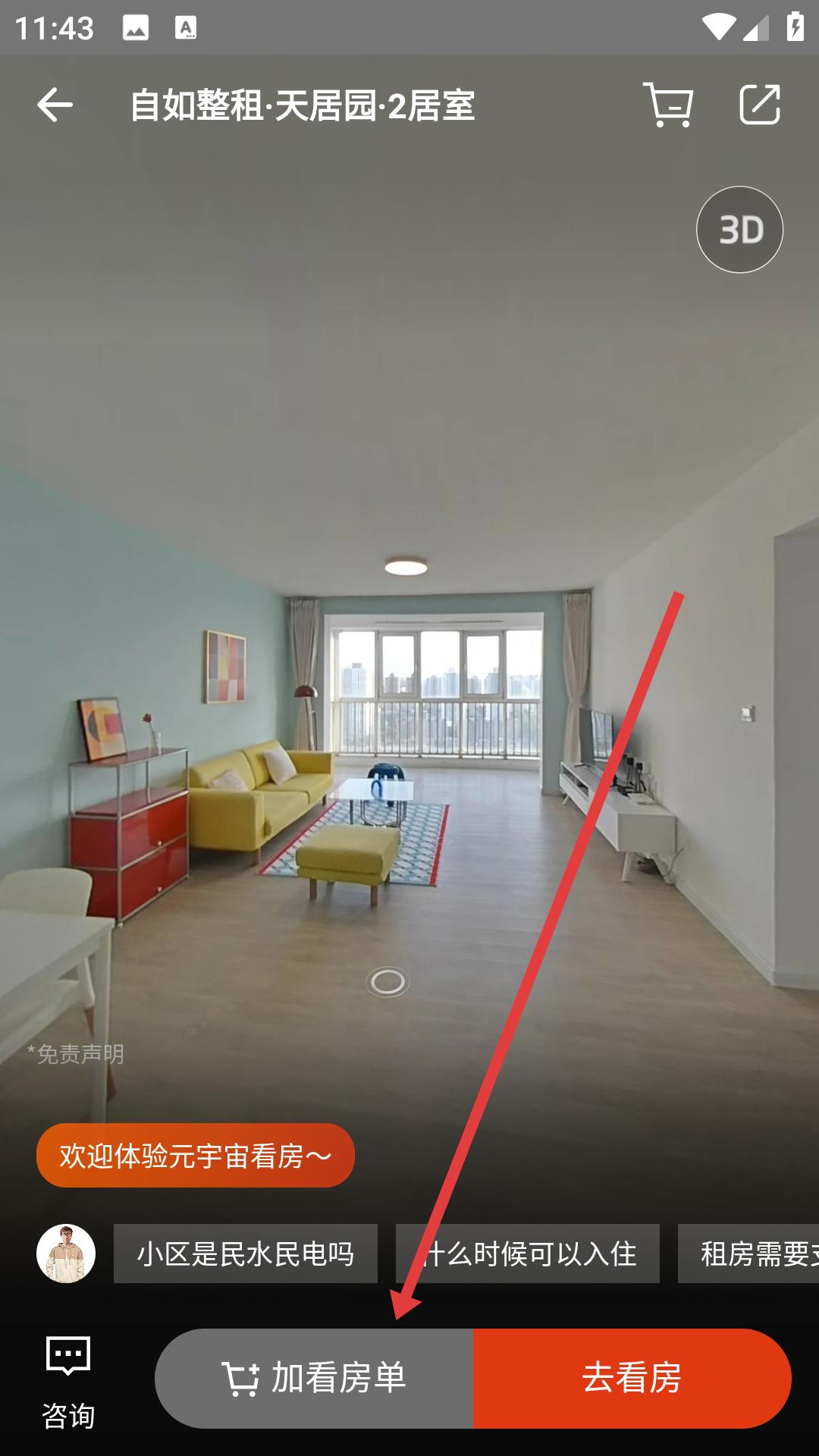 3、在看房相關操作頁面,看到加看房單按鈕,點擊該按鈕,將房源加入看房單,方便后續查看。