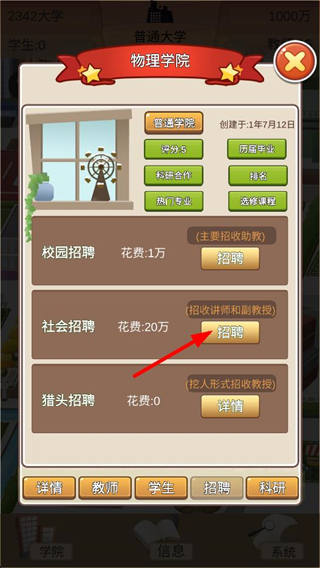3、在已開設的學院界面,消耗資金通過社會招聘等方式招聘教師,充實學院的師資力量,提升學院實力。