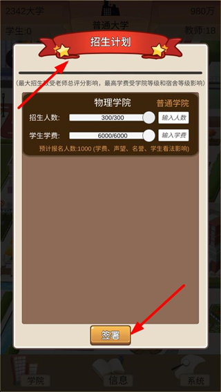 4、在招生計劃界面,設置招生人數與學費,點擊簽署按鈕完成招生安排,吸引學生入學,積累學校資源。
