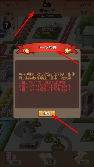 1、查看學校升級條件,了解每年8月1日的評定要求,點擊確定按鈕,開啟大學的建設與升級流程。