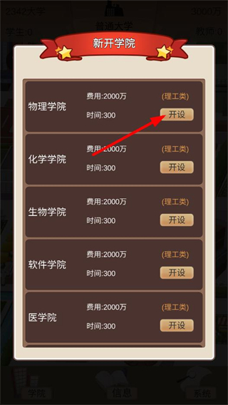 2、進入新開學院界面,消耗資金點擊開設按鈕,創建對應的學院,豐富學校的學科設置,推進學校發展。