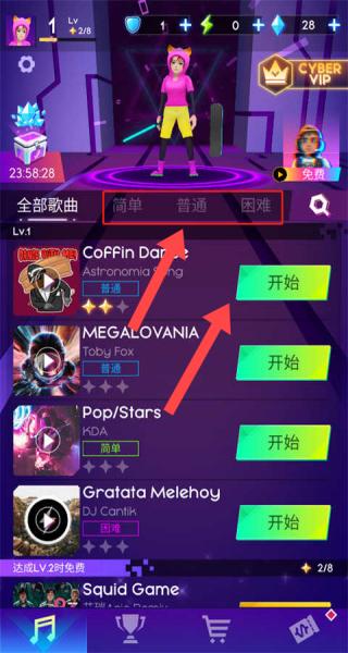 2、挑選音樂闖關:選好難度后選擇音樂,點擊開始進入闖關,還可在開始前裝扮角色。