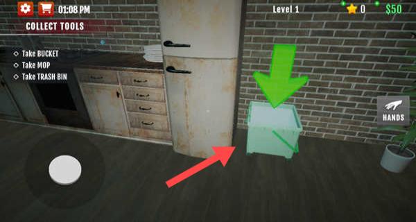 3、進行現場清理:到達現場后,先將桶子裝滿水,用拖把沾水清理血跡,完成清理任務獲取金幣獎勵。